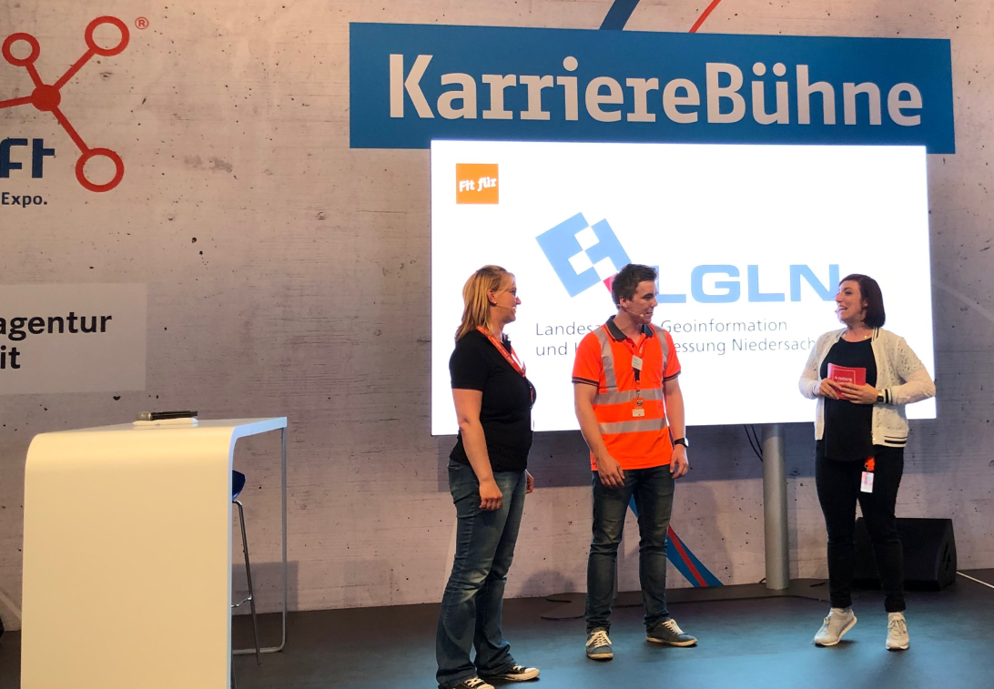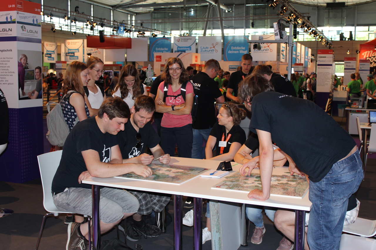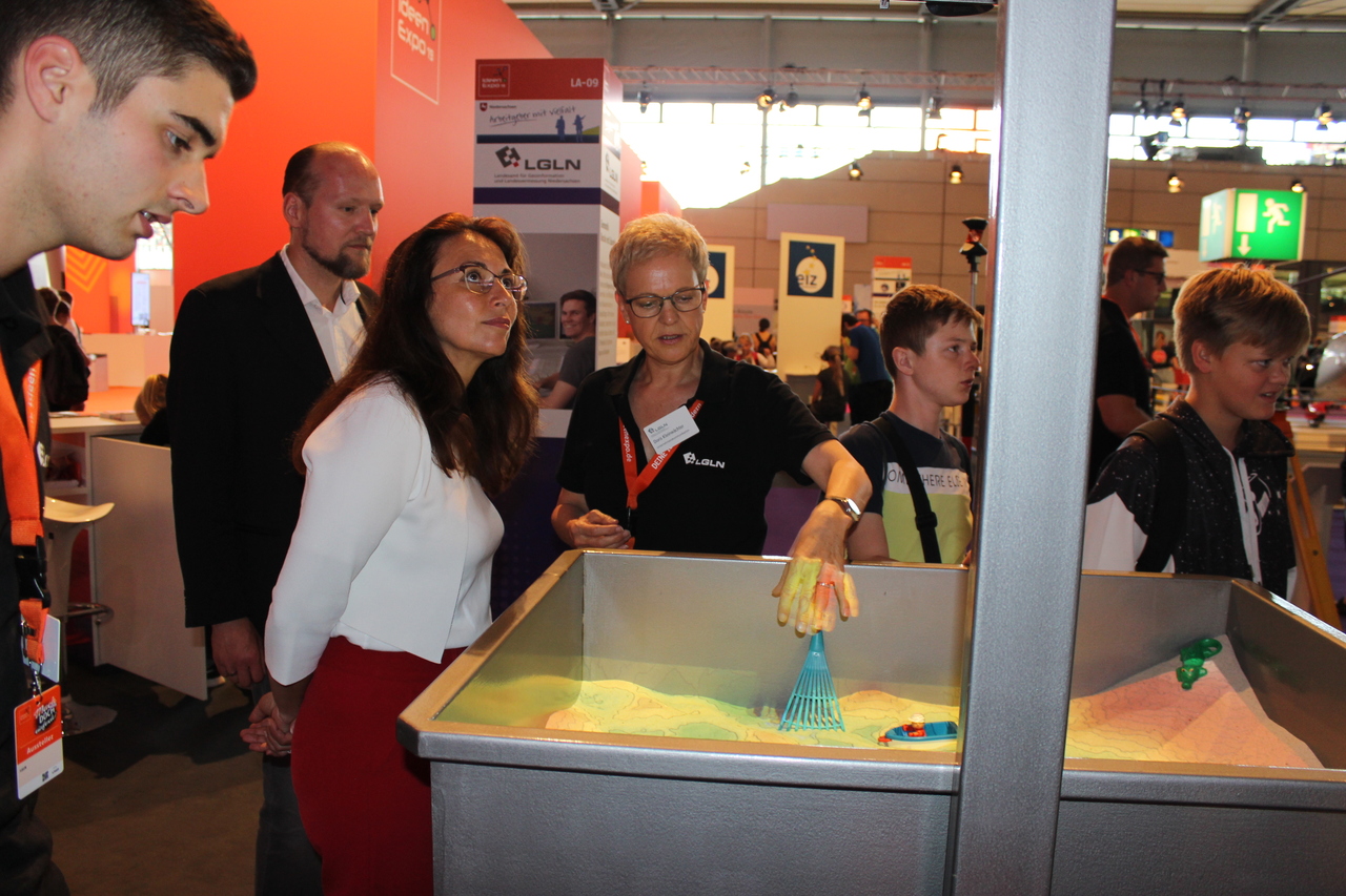 Die IdeenExpo ist, besonders für unser - bei Schüler/innen wenig präsentes - Berufsfeld, eine ausgezeichnete Gelegenheit, sich von seiner schönsten Seite zu zeigen und ins Gespräch zu bringen. Dazu boten wir eine Schrittlängenmessung mit unserem Hochleistungstachymeter an, hatten von der Jade-Hochschule in Oldenburg die Augmented Reality Sandbox ausgeliehen, um Landschaft lebendig werden zu lassen, und das Niedersachsenpuzzle dabei. Unsere Azubis, Vermessungstechniker/innen und -ingenieur/innen aus allen LGLN-Dienstorten in Niedersachsen erzählten über unsere Ausbildungsberufe, Möglichkeiten für Schulpraktika, Karrierechancen und Studiengänge. Außerdem präsentierten wir unsere Berufe Vermessungstechniker/in und Geomatiker/in auf der Karrierebühne.